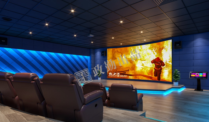 重慶某消防救援站多功能廳,是集集體觀影、會議講座、卡拉OK等實用功能為一體的綜合性功能庫室。多功能廳建設(shè)面積近189平方米,室內(nèi)裝修全部采用阻燃、難燃材料,設(shè)置標準階梯式座位57個,采用專業(yè)11.2聲道數(shù)字影院系統(tǒng),配備高清4K\3D投影播放儀、250寸16:9的4K+3D幕布、3D眼鏡、影院級立體環(huán)繞音響等設(shè)備,可觀看廣電有線電視、網(wǎng)絡(luò)高清、數(shù)字終端、藍光高清影碟機等途徑播放的各類3D、HD和普通影片,觀影時畫面清晰、音響逼真,具有很強的感官沖擊力。此外,多功能廳還專門設(shè)置了雙向疏散防火門、緊急照明開關(guān)、影院臺階燈、警鈴及聲光報警裝置,確保消防指戰(zhàn)員在放松身心的同時能夠第一時間響應出警。