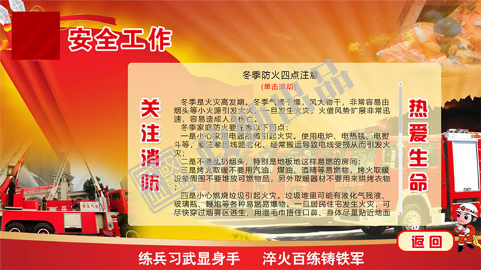 消防綜合查詢系統(tǒng)系統(tǒng)共分八個模塊,分別是:基地概況、法律法規(guī)、消防標(biāo)志、消防常識、消防視頻、消防裝備、知識問答、消防互動。