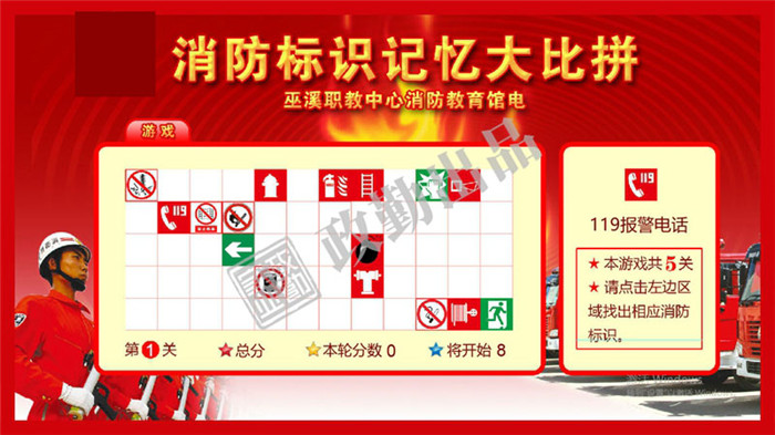 游戲分3關(guān),玩過每一關(guān)后,雷會增加一個,通過記憶的方式增強(qiáng)對消防標(biāo)志的認(rèn)知。