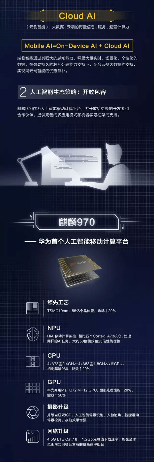 9月2日晚,華為在德國(guó)柏林的IFA展上正式發(fā)布麒麟970芯片。麒麟970采用10nm工藝打造,CPU、GPU以及Modem全面提升,全球首次內(nèi)置神經(jīng)元網(wǎng)絡(luò)單元(NPU)完成人工智能計(jì)算。預(yù)計(jì)將在10月16日德國(guó)慕尼黑發(fā)布的Huawei Mate 10上首用。